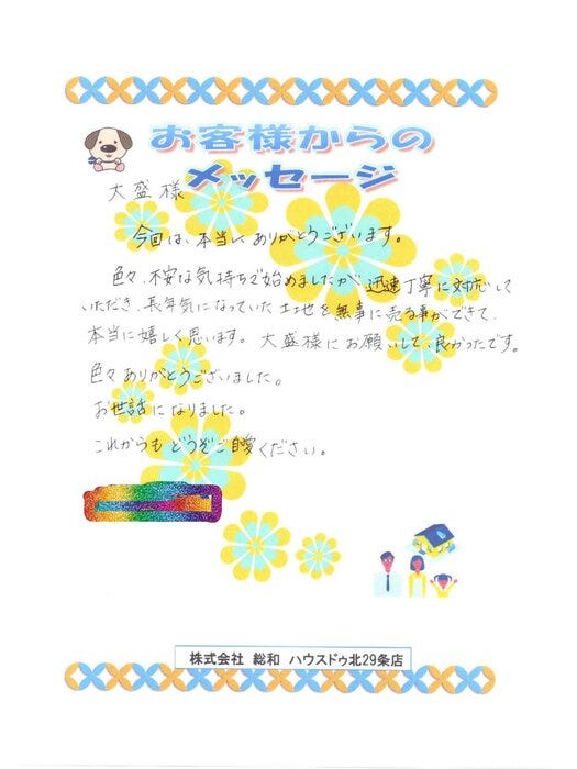 この度は、ご成約おめでとうございます。 所有者様が遠方なこともあり、ご不安な点も多かったかと思います。 とても嬉しいメッセージを頂けて、感謝しております。 現在、物件をお任せ頂いているお客様にも満足して頂けるようこれからも頑張ります。